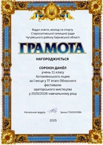 Вітаємо Сорокіна Данііла, учня 11 класу Хотімлянського ліцею, з перемогою — І місце у ТГ етапі Обласного фестивалю ораторського мистецтва у 2025/2026 навчальному році!